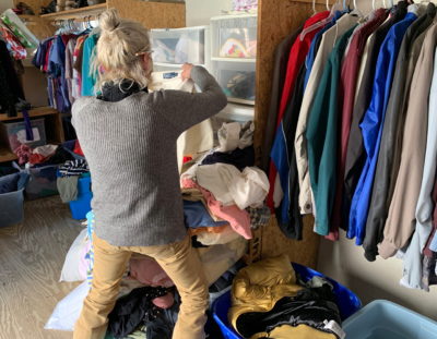 She recently had surgery, so has been off work from her job at a restaurant. The food pantry is a “huge blessing,” she said – so she volunteers as a way of giving back. She says Russell gets to know everyone, and keeps a running list of what they need – a microwave, a pair of boots, a bunk bed. “She’s firm, but she’s fantastic,” Lydecker said of Russell. “My daughter just got her eighth grade formal dress” – Russell had found it and set it aside for the girl, Bryanna Rhoades, who was volunteering as well.