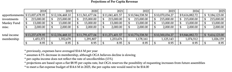 - Per capita projections – showing that, if nothing else changed, and if the PC(USA) membership continues to decline, per capita would have to rise from the current $8.95 per member to $14.00 per member in 2025 to maintain a flat expense budget of $14.6 million for OGA. Appendix G Per Capita Projections