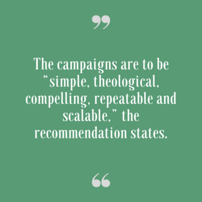 The campaigns are to be “simple, theological, compelling, repeatable and scalable,” the recommendation states.