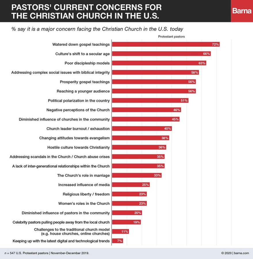 About two-thirds (66%) of pastors say a major concern for Christianity is “culture’s shift to a secular age,” followed by 63% who identified “poor discipleship models” as a major concern and 58% who named “addressing complex social issues with biblical integrity,” the survey says.