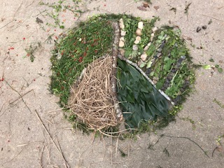 Peace sign made from natural materials gathered around the yard. Placed on the patio near the side door of the house.