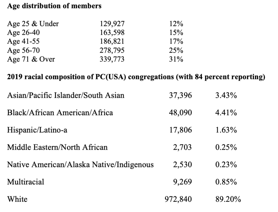 Demographically, the PC(USA) skews white (89.2%), female (58%) and older (25% ages 56 to 70 and 31% ages 71 and older, but only 12% age 25 and younger).