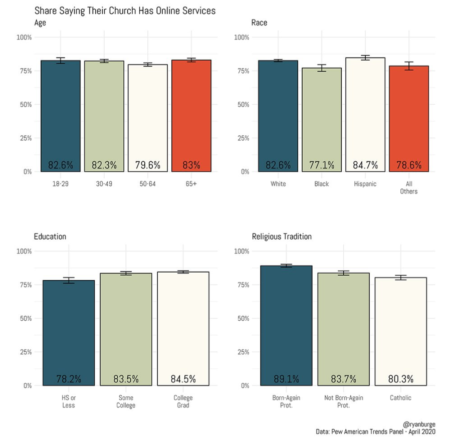The survey also allayed fears that age or economic disadvantages have created large demographic disparities when it comes to accessing streaming services. For instance, those who are 65 and older were just as likely to say that their institution was streaming services as the youngest respondents in the sample. Only African Americans as a group were slightly less likely to say their churches were online, compared with white and Hispanic respondents.