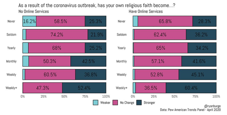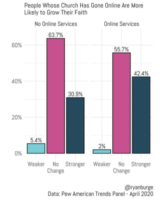 Even better from the clergy’s point of view is that their members who have gone online report a larger growth in faith than those whose services have not moved to online streaming. Of those who had moved online, 42.4% said that their faith had grown stronger. For those without an online service to watch, the share of those who said that their faith had grown was a more modest 30.9%. Only very small shares of either group said that their faith had gotten weaker because of COVID-19.