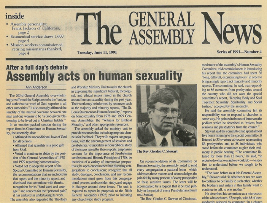 Earlier at the 1991 General Assembly, the Special Committee on Human Sexuality had presented two reports, one titled “Keeping Body and Soul Together: Sexuality, Spirituality, and Social Justice,” as well as a minority report approved by five of the sixteen committee members. The General Assembly rejected both reports and voted to uphold the “definitive guidance” on homosexuality issued by the UPCUSA in 1978, which barred LGBTQIA+ Presbyterians from ordination.