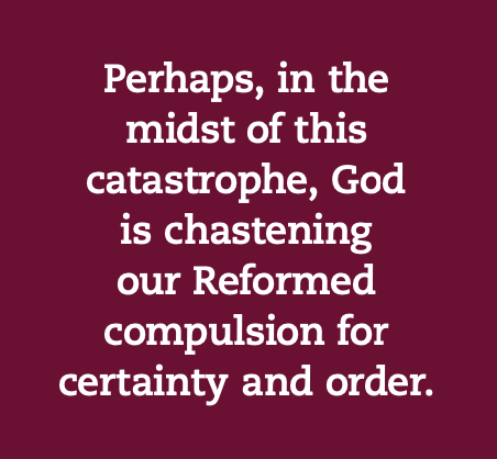 I respect Joe Small’s penitential and hopeful Communion fast. It is deeply and fully Christian in a Reformed way, acknowledging not only that Christ has died but also that he is risen into the hiddenness of God. So, I think, is that nurse’s reverent reception of Communion – in a supply closet, watching a screen, drinking cranberry juice – Christian and Reformed. Grateful for Jesus really present in the sacrament, she finds the strength, in spite of the personal danger, to be really and selflessly present for her patients.