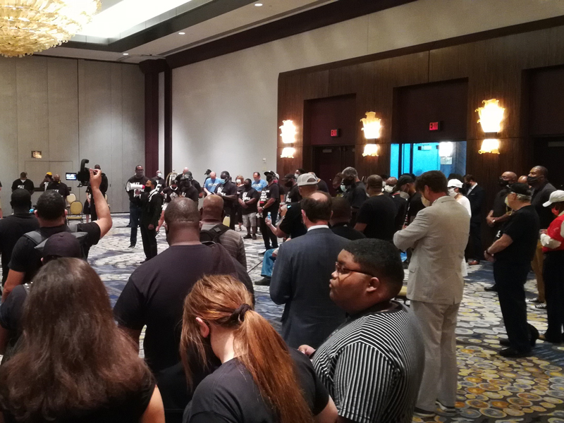 Gill gathered with other clergy leaders who met for prayer in the ballroom of the Hilton-Americas Hotel, across from Discovery Green. A rabbi, an imam and a Protestant minister prayed, as the other faith-based leaders — wearing masks due to the COVID-19 pandemic and following social-distancing protocols — shared their commitment to justice and peace in solidarity.