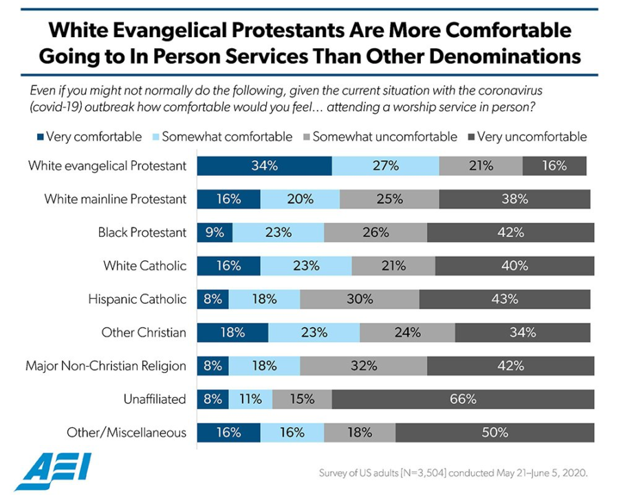 “We’re seeing among lay people a significant amount of discomfort in going back to formal in-person religious practices,” said Daniel Cox, a research fellow at AEI who led the study. “People are equivocating and uncertain about whether they feel comfortable attending.”