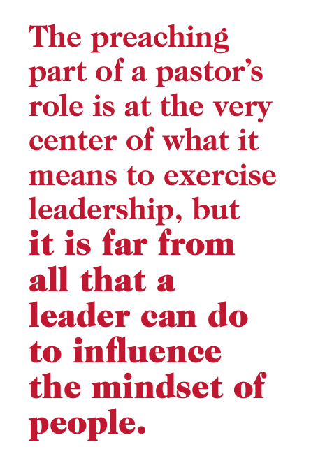 The preaching part of a pastor’s role is at the very center of what it means to exercise leadership, but it is far from all that a leader can do to influence the mindset of people. To some extent, this influence is part of any form of pastoral care, but it is also inherent in many other actions. It can be part of group spiritual direction or focused conversation groups initiated by the pastor. It can be part of any mentoring of individuals, and it can be encompassed in retreats. Pastoral care is not just caring for people in a human sense but also promoting the reign of God by attending to people’s basic assumptions and beliefs about God and life as an apprentice of Jesus.