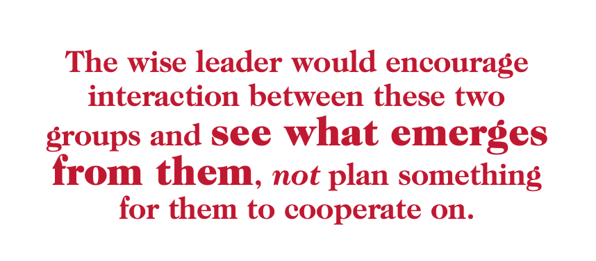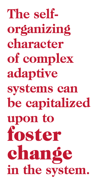 The self-organizing character of complex adaptive systems can be capitalized upon to foster change in the system. Among the ways to encourage self-organizing are fostering diversity in the system, promoting experimentation and encouraging new interconnections or relationships. Encouraging diversity and experimentation means giving up any sense of tight control and depending instead on influencing what emerges from diverse inputs from people and what comes out of experimental endeavors. From this perspective, the more diverse the congregation the better, in terms of producing new initiatives that break out of the status quo. For example, a congregation that has a number of people who are committed to social activism and others with a passion for personal evangelism has a diversity that could be fruitful. The wise leader would encourage interaction between these two groups and see what emerges from them, not plan something for them to cooperate on. Their diversity offers the potential for self-organizing that can yield an unexpected synergy and a passion that is unlikely from entering into a top-down plan. The thoughtful leader can create contexts in which fruitful interaction and cross-fertilization of ideas can occur.