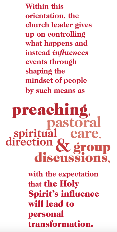 The picture we see emerging through this systems analysis is one in which a pastor can be an authentic shepherd of a disciple-forming congregation within an institutional church context. Within this orientation, the church leader gives up on controlling what happens and instead influences events through shaping the mindset of people by such means as preaching, pastoral care, spiritual direction and group discussions, with the expectation that the Holy Spirit’s influence will lead to personal transformation. This personal change opens up the possibility of forming both individual and corporate visions of what this faith community can become. The given mindsets and visions can be the foundation for actions that take shape largely through self-organizing.