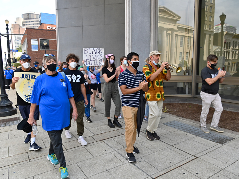 LOUISVILLE — Presbyterians and their partners in Louisville, Kentucky and in cities across the country took to the streets Saturday as part of the Presbyterian Week of Action, calling for an end to racial violence and attracting honks of support from motorists as the Louisville assembly of nearly 150 people marched from the Presbyterian Center to a downtown square honoring Breonna Taylor.