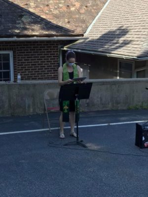 It has taken a lot of work to figure out how to get cars and people in there safely, and we have already tested a couple different times in the morning to adjust for maximum shade.  We must accept that if it rains (as it did this past Sunday), we have to cancel and host worship via our Facebook Live platform only. People make reservations in advance to accommodate contact tracing (we’ve been using Eventbrite.com) and are welcomed by ushers with a touchless check-in.  And while this has gone smoothly (we can easily contact the list for changes in parking or cancellation), many of us have had feelings of lament around asking people to register for a ticket (even though it’s free!) to attend church.  Everyone wears a mask and bring their own chair, and we sit, stand, set up and stay six feet apart. And, as an added precaution, everyone is double that distance from myself so that I can speak without a mask on during worship (the mask muffled the audio significantly on the livestream). We still do not have the audio just right, but we are working on it. And, for those who find 8 a.m. outdoor worship inaccessible, we livestream the service and I do a separate 10-minute prayer service at 10 a.m. on Facebook Live.