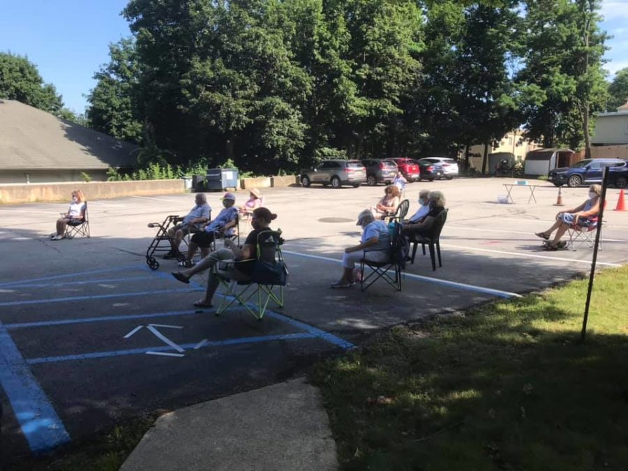 When the congregation’s reentry team started meeting (online, of course) at the beginning of June, we had much more glamourous sites in mind — perhaps a park with a pavilion or the pond in the middle of town.  But gradually, our team realized that the most practical and feasible option was our own upper parking lot space (though not known for its beauty).