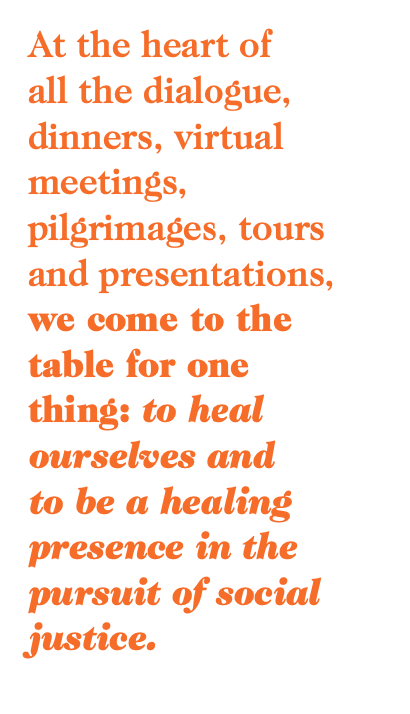 At the heart of all the dialogue, dinners, virtual meetings, pilgrimages, tours and presentations, we come to the table for one thing: to heal ourselves and to be a healing presence in the pursuit of social justice. Our conversations on race discrimination, racial inequity, racism in schools and housing, employment, economics, public health, police brutality and all other areas of social concern empower those who come to the table to be change-makers in the world. We realize we have many systems that are cracked, and people are slipping through those cracks. We are broken at our foundation. Now, as a nation in the middle of a worldwide pandemic, we have discovered that we need to rediscover the core values that CTTT upholds: inclusion, respect and tolerance, honesty, truthfulness and transparency, justice, compassion, mercy, forgiveness, love, peace and nonviolence, healing, transformation and liberation. These values create a circle of protection around us, bringing us back to the basics that make us one human race.
