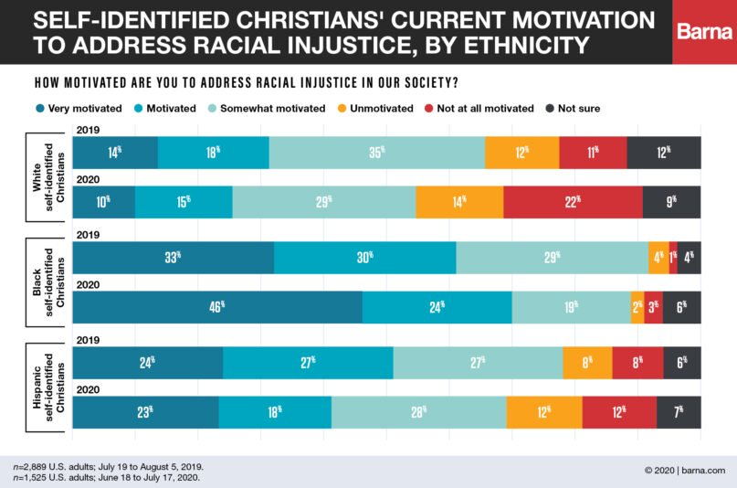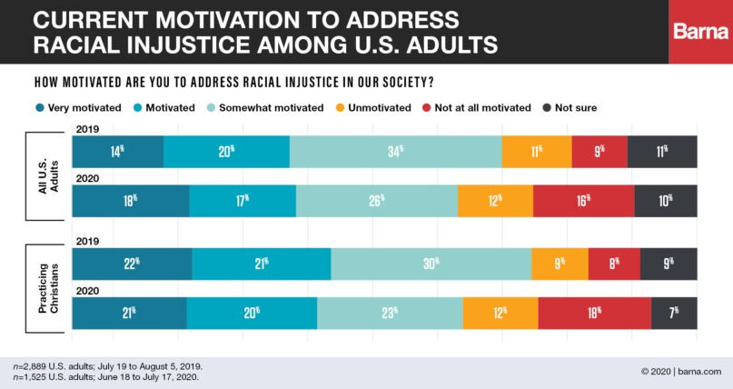 Meanwhile, for Black self-identified Christians, the motivation to address racial injustice increased from 63% who were motivated or very motivated in 2019 to 70% in 2020 (the sample size for Black practicing Christians was too small in 2020 to use as a comparison, according to Barna).