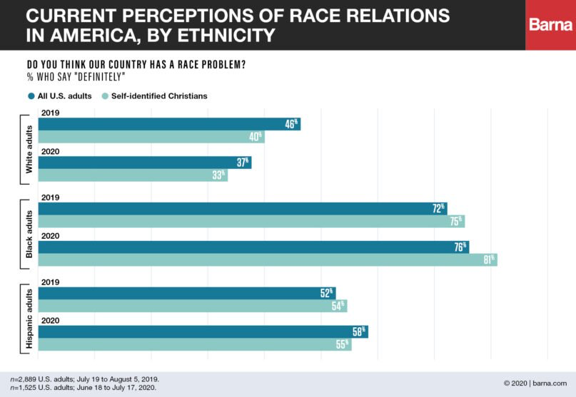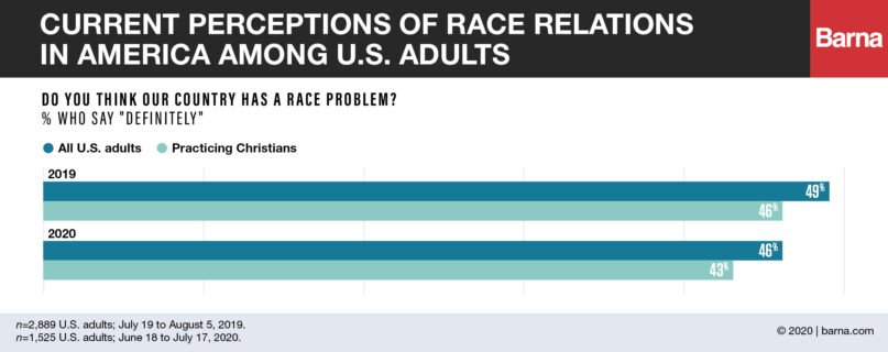 But many U.S. adults in general — and practicing Christians specifically — continue to think there is not a race problem in the country, the report found. The number of U.S. adults who said there “definitely” is such a problem remained nearly the same from 2019 to 2020, dropping slightly from 49% to 46%, while practicing Christians’ response similarly dipped slightly from 46% to 43%.