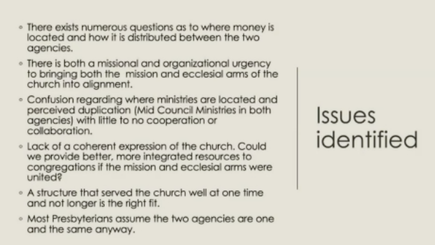 Another COGA work group is looking at issues of merger and unity — including the possibility of a merger of the Presbyterian Mission Agency and the Office of the General Assembly. COGA member Eliana Maxim stressed that whatever happens, “this cannot be simply driven by money” — what’s needed is a common vision for the denomination and how that could be implemented.