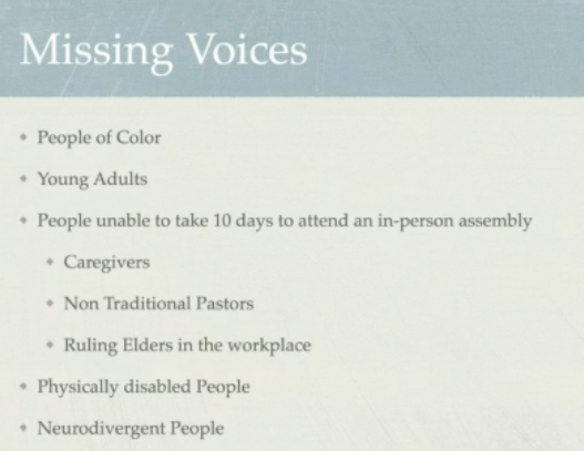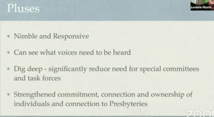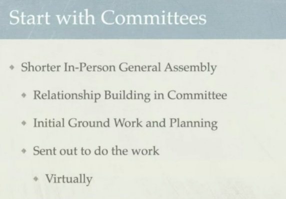 One possibility that was floated: Have a shorter in-person General Assembly focused on committees, with time for committee members to build relationships and do initial work. After that, the commissioners would go home and the committees would continue to do their work virtually — which would give the committees more time to dig deeply into issues, respond to new concerns that rise, build connection and ownership for the work across the church.