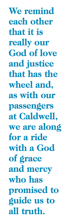 Every day in working together as pastors, we learn more about how our respective lives, our perspectives and life experiences complement and can bring out the best in each other. In sharing leadership, we have learned to speak truth to each other, to listen to each other, to coach and at times correct each other. We remind each other that it is really our God of love and justice that has the wheel and, as with our passengers at Caldwell, we are along for a ride with a God of grace and mercy who has promised to guide us to all truth.