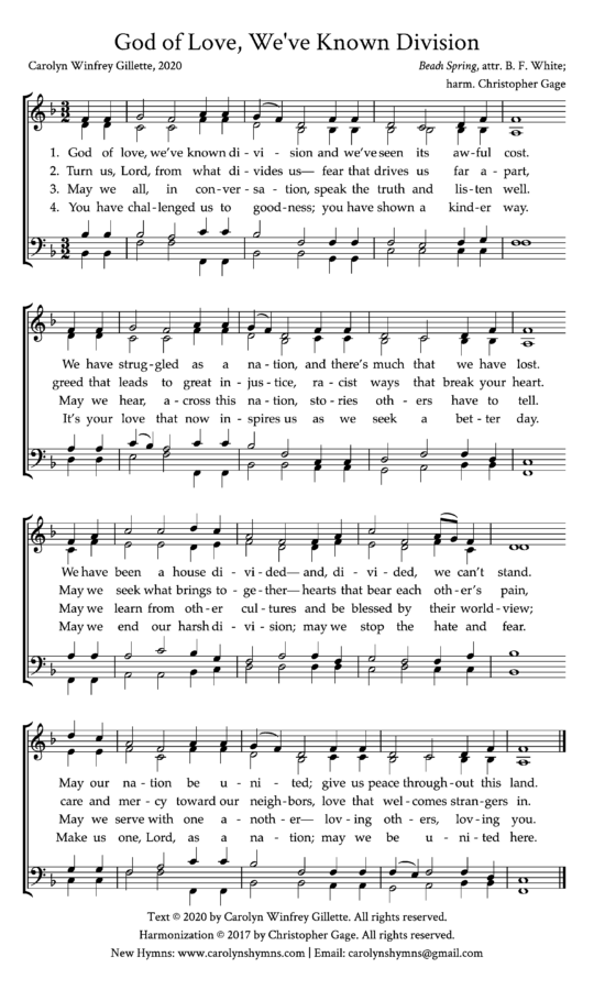 Composer’s note: Augustine is often quoted as saying, “Those who sing, pray twice.” This new hymn is a prayer for unity in our nation — a unity grounded in love and justice for all. At this time of so much division in our country, our nation needs prayer, and we as churches are called to pray and work for the love, justice, peace and unity that God desires. This new hymn was completed on the day the TV news networks announced that Joe Biden had won the presidential election.