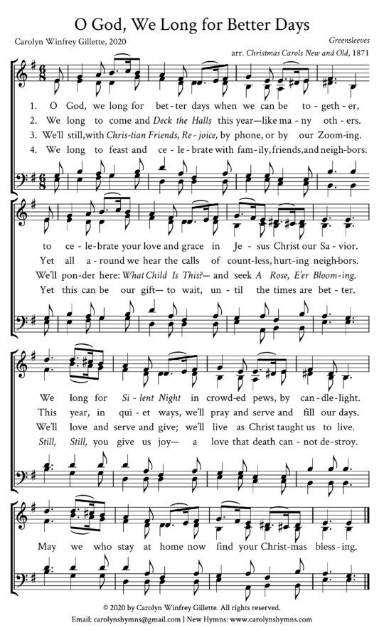 “O God, We Long for Better Days” is a new hymn for use before and after Christmas. Churches are welcome to use it for free. Congregations may wish to share it with members who are staying at home and are granted permission to use it in online worship services.