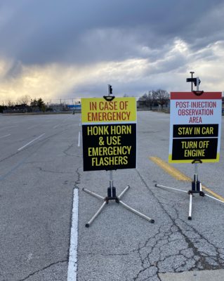 My station is in the final lot, as the vaccinated are about to depart. Just behind me stand two signs in yellow and black. Post-Injection Observation Area, Stay in Car, Turn Off Engine. In Case of Emergency, Honk Horn & Use Emergency Flashers. EMTs sit in the corner of the final lot watching and waiting. Planes fly just overhead around the nearby airport. It is cold there on the pavement in the late afternoons.
