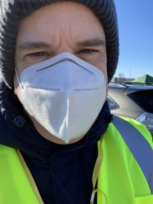 We prepared for Spanish and Arabic speakers and for differently abled adults. We kept a close eye out for horns or signs of distress. My co-workers on the lot (including a chemical engineer, a banker and a retired trainer and teacher) smiled and waved and smiled and waved. From bundled-up coats, bright yellow safety vests and masked faces, we tried to share some signs of care and encouragement.