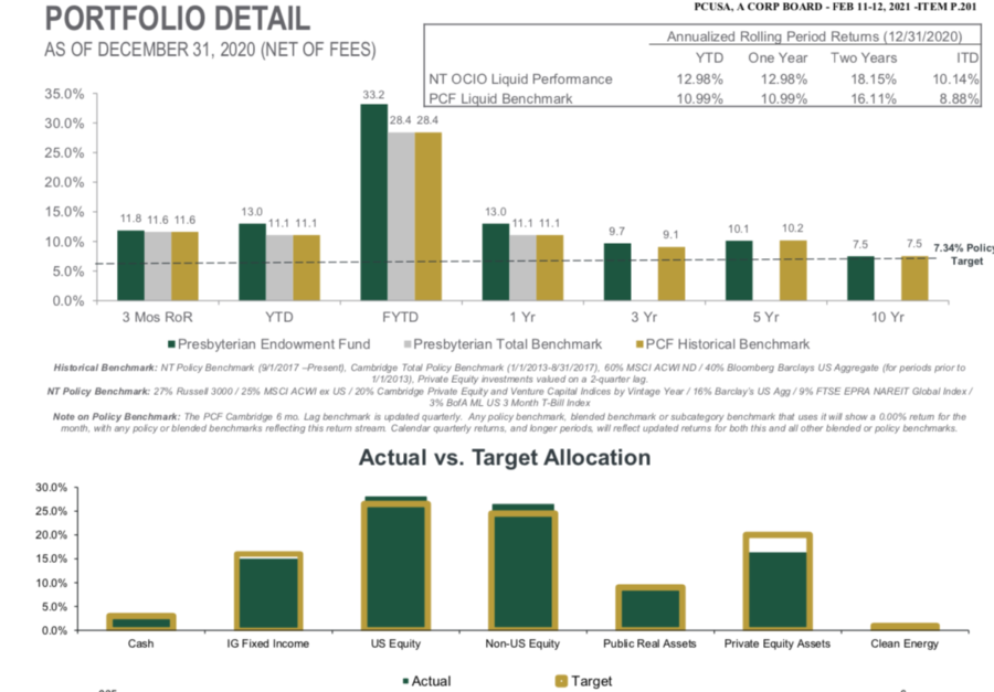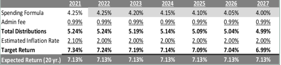 The Presbyterian Foundation is responsible for managing and investing PC(USA) endowments, and currently provides funds to the Presbyterian Mission Agency using a spending formula — currently 4.25% of the average market value of endowments held at the Foundation (based on a 20-quarter rolling average with an 18-month lag). The proposal: starting in 2023, to reduce that incrementally down to 4% by 2027.