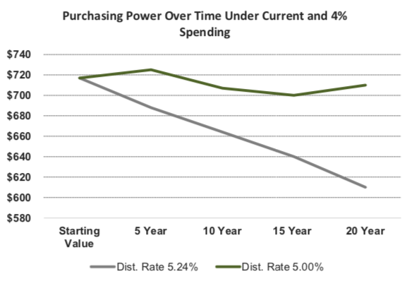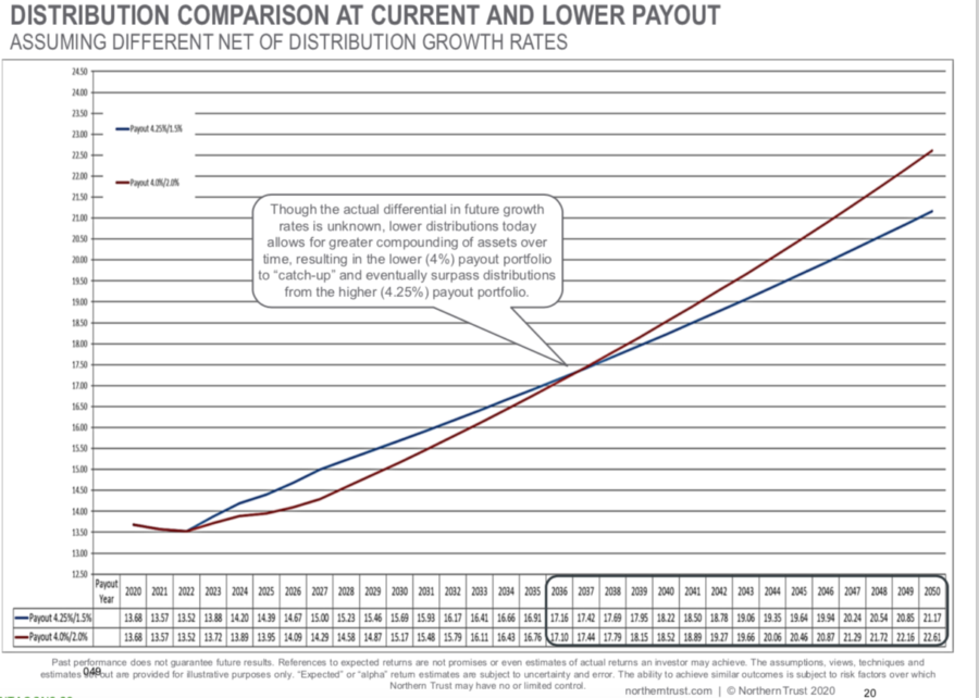Paul Partington is a senior vice president with the Northern Trust Corporation, which is the outsourced chief investment officer the Foundation contracts with to manage the portfolio. Partington said the intent of the proposed changes is to maintain the endowment’s purchasing power for the future so that over time, “you actually get more distribution at a lower distribution rate. … There are more dollars in the portfolio that compound over time. That compounding is a very powerful element.”