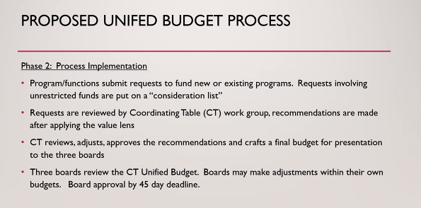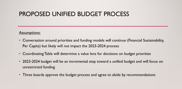 Lueckert also outlined some assumptions built into the proposal — among them, that the Coordinating Table would agree on a “value lens” it would use for making decisions about what’s most important to fund.