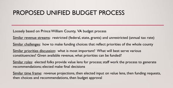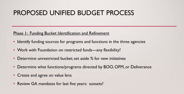 Barry Creech, PMA’s director of policy, administration and board support, put it this way: “If we’re going to have a unified budget, we’re going to have to have some priorities around which to build this budget.”