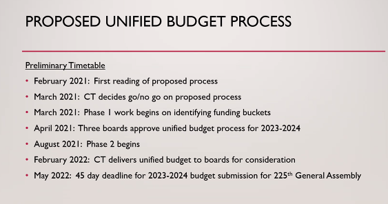 The timetable being proposed calls for the boards of OGA, PMA and the A Corporation to approve the process in April and for unified budgets to be ready for consideration by February 2022.