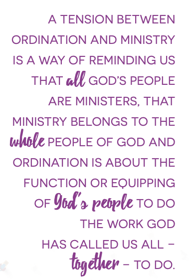 The bottom line: A tension between ordination and ministry is a way of reminding us that all God’s people are ministers, that ministry belongs to the whole people of God and ordination is about the function or equipping of God’s people to do the work God has called us all – together – to do.