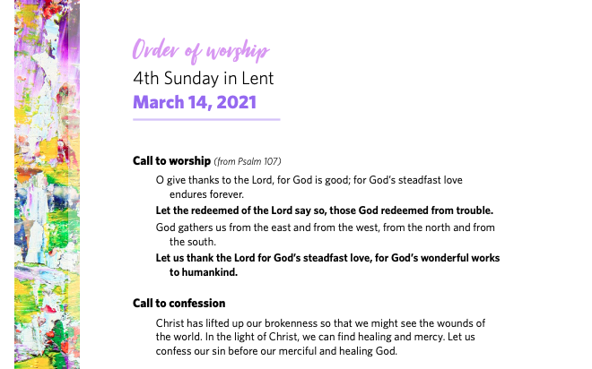 Download the PDF of the full order worship: Liturgy 03-14-21
