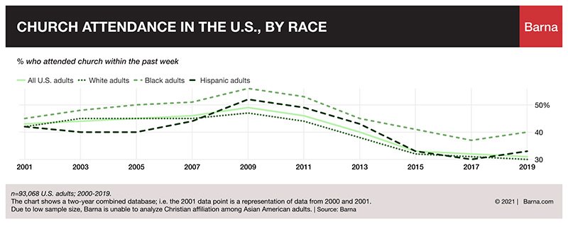 Pre-pandemic, Black adult church attendance appeared to be on the rise, with 40% saying in 2019 they had attended a service in the past week, up from 37% in 2017. U.S. weekly church attendance overall continued its decline to 31% in 2019.