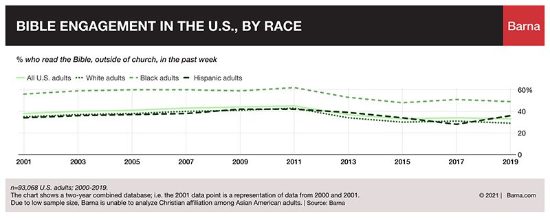 About half of U.S. Black adults (49%) were engaged in Bible reading from 2001 to 2019, more than any other racial/ethnic group and significantly more than U.S. adults as a whole (33%). Bible reading among Black Americans has changed very little over the years, even as other measures of religiosity have dropped, according to the study.