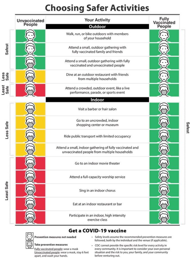 Officials were quick to note they still recommend widespread mask use for people who are not fully vaccinated, and that many activities remain unsafe for those without the shots. A slide accompanying the announcement categorized many activities as “less” or “least” safe for people who are not fully inoculated against COVID-19. Attending a full-capacity indoor worship service or singing in a chorus, for instance, were among the actions designated as “least safe” for unvaccinated people.