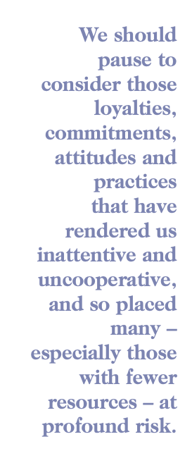 We need to recognize that when persons, communities and institutions respond to unprecedented situations, missteps and mistakes are inevitable. But we should also pause to consider those loyalties, commitments, attitudes and practices that have rendered us inattentive and uncooperative, and so placed many – especially those with fewer resources – at profound risk.