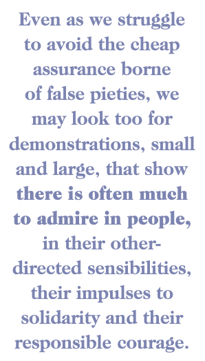 Finally, and not apart from anxieties, fears and terrible sufferings, we may also look and hope for traces of grace and the kingdom. Perhaps we shall come to a more accurate sense of our place as capable but also limited, dependent and anxious creatures. Perhaps we will be inspired by glimpses of gracious moral commitment. No doubt, in the face of pandemic, we have seen and shall yet see our share of destructive attitudes and actions — ones that are defensive, irresponsible, callous and xenophobic, ones that are beside the point and ones that put people at risk. But even as we struggle to avoid the cheap assurance borne of false pieties, we may look too for demonstrations, small and large, that show there is often much to admire in people, in their other-directed sensibilities, their impulses to solidarity and their responsible courage. My current incomplete and anecdotal list includes: hospital staff who work long shifts in dangerous circumstances; a divided Congress that sometimes manages to enact relief for persons struggling with layoffs and overdue rent, for small businesses and large employers; providers of essential services — from preschool staff to sanitation workers, supermarket employees, pharmacies, police and fire departments, janitors, government bureaucrats and news media personnel working from home; and schools, businesses, families and friends learning how to communicate remotely.