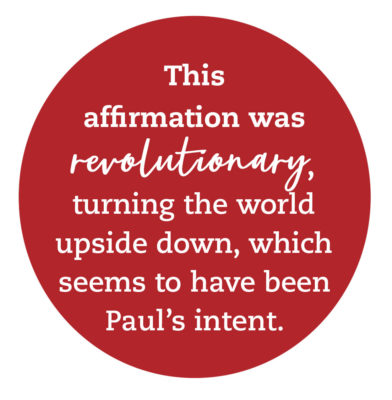 It was in this kind of world, a hierarchical culture of conquest and domination, that Paul made a stunning statement: a baptismal affirmation that “there is neither Jew nor Gentile, neither slave nor free, nor is there male and female, for you are all one in Christ Jesus” (Galatians 3:28). This affirmation was revolutionary, turning the world upside down, which seems to have been Paul’s intent. As Brigitte Kahl puts it in “The Fortress New Testament Bible Commentary,” for Paul, the entire imperial model of “divide and rule” was drowned and washed away in the waters of baptism. The distinctive markers that created binary oppositions of “us and them” were