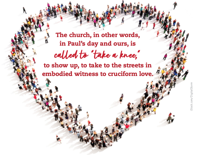 This is, I think, the kind of witness and resistance that Paul had in mind for the Galatian churches. The church, in other words, in Paul’s day and ours, is called to “take a knee,” to show up, to take to the streets in embodied witness to cruciform love. The Roman mentality is still part of the air we breathe, reflected ad nauseum in rhetoric about “winners” and “losers.” Losers are those who have failed, who have been beaten to death, if not physically, then spiritually; and winners continue to inscribe domination upon them. To be great is to win, to vanquish one’s foes.