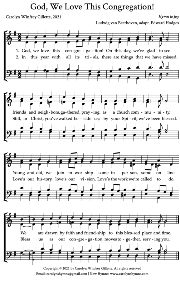 Carolyn Winfrey Gillette has written over 400 hymns to well-known tunes, including several to counter racism, sexism and gun violence that have been sung by thousands of churches with feature stories about them in The Christian Century, The New Yorker, Sojourners, PBS-TV and NPR. Presbyterian Outlook has commissioned Carolyn to write many hymns. All of her hymn texts can be found on her website: carolynshymns.com