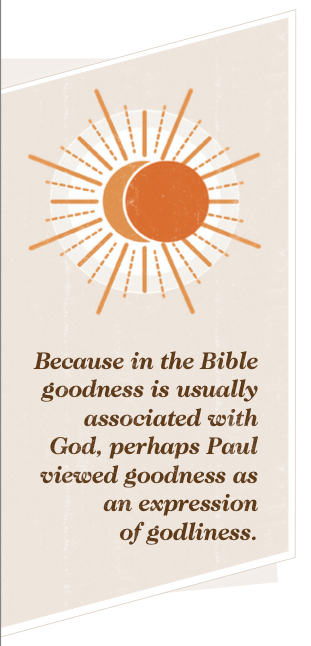 Because in the Bible goodness is usually associated with God (see Psalm 25:8; Psalm 34:8; Psalm 100:5; Psalm 136:1; Ezra 3:11; Mark 10:17-18), perhaps Paul viewed goodness as an expression of godliness. That’s plausible, because goodness is produced in believers by God’s Spirit who dwells in them. In fact, without the Spirit, goodness wouldn’t be possible.