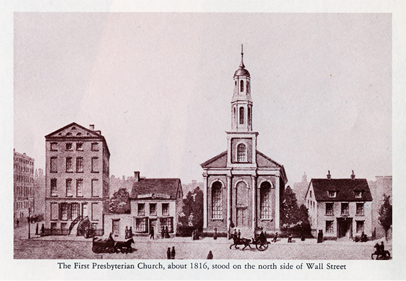 First Church was established in 1716, and its first building was constructed on Wall Street in 1719. Members of First, fleeing the density of Wall Street and its environs, founded Brick Presbyterian Church in 1768. The expanding membership organized Rutgers Presbyterian Church, on Henry Street, in 1798. In 1835 a massive fire destroyed most of what was then considered Old New York, including the building on Wall Street. Continuing to follow their membership north, First built a new stone structure on Fifth Avenue, and the congregation moved there in 1846. In the 1850s two new Presbyterian churches were organized nearby: University Place and Madison Avenue.