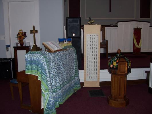 Perhaps adding some color to the sanctuary is a way to introduce art. In my context, this has been the easiest and most visible way to bring art into the space. For Lent and Advent, I drape the same purple cloth, but I place it somewhere different each time. In Advent I have a solid purple cloth and a sparkling purple tulle that I wrap in a twist on the Communion Table as a reminder of how divinity and humanity are intertwined. For Easter I bring out golds and whites. One year an artist created a tree that stood in the sanctuary throughout Lent. Small, crafted leaves decorated it and as Lent went on, the youth in the congregation pulled the leaves out until the tree was completely bare on Good Friday. For Easter Sunday the tree was decorated with paper flowers.