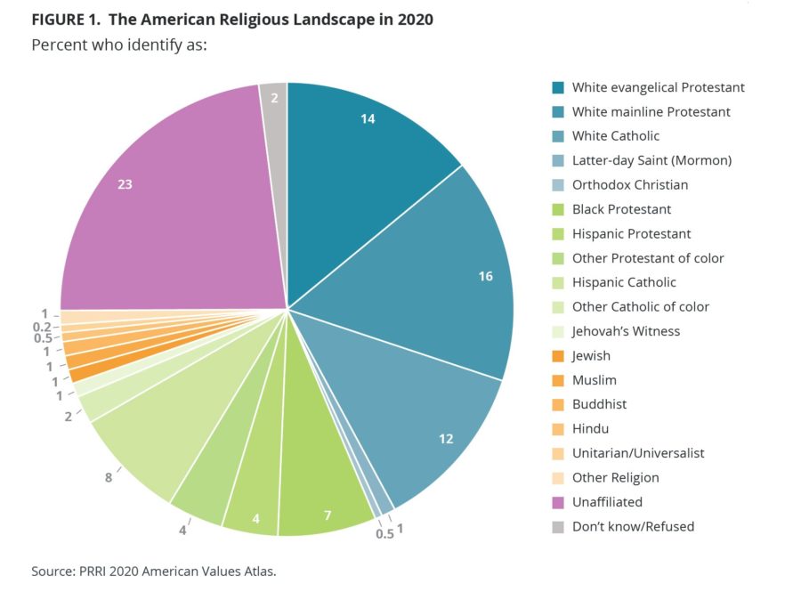 Clergy and other faith leaders will be perhaps most interested in PRRI’s finding that religiously unaffiliated Americans, or “nones” in religion demography parlance, have lost ground, making up just 23% of the country. The complex group — which includes atheists, agnostics and some people who say they pray daily but don’t claim a specific faith tradition — peaked at 25.5% of the population in 2018.