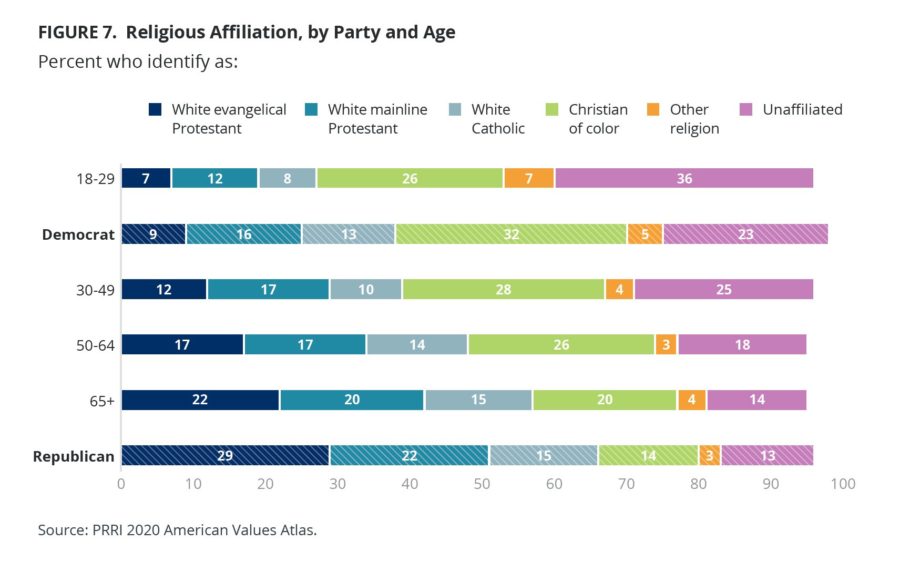 Further complicating the political calculus are the ages of each faith community. White evangelicals are now the oldest religious group, with a median age of 56. White mainliners and Black Protestants share the same median age — 50 — with white Catholics skewing closer to evangelicals at 54.