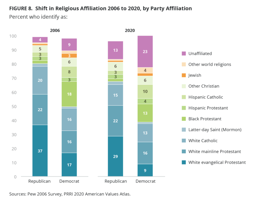 And the political power of unaffiliated Americans continues to grow. Mainliners represent the same percentage of each political party in 2020 as they did in 2006 — 22% of Republicans, 16% of Democrats. They are also politically split three ways: According to the report, 33% identify as Republican, 35% identify as Democrat, and 30% identify as independent. By contrast, the percentage of unaffiliated Americans has expanded in both parties: They now represent 23% of Democrats (compared with just 9% in 2006) and 13% of Republicans (compared with 4%).