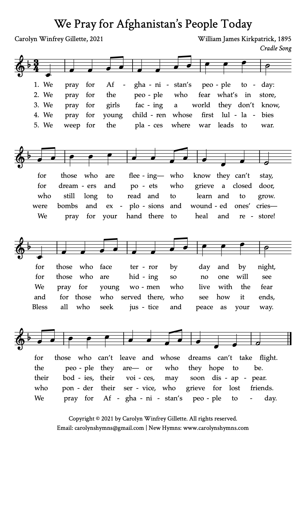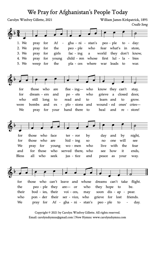 This hymn is written to a gentle, peaceful tune for a people who need gentleness, peace, justice and human rights in their land (as we all do, in our lands). It is a prayer for people who suddenly find themselves as desperate refugees, people who feel trapped and hopeless, vulnerable people and girls and women whose dreams have been shattered. It is a prayer for people who know that war is a terrible thing and who have experienced many losses. It is a prayer for children who have grown up knowing nothing but war. It is a prayer for all in the land — and all of us in this land — who long for peace and justice in every place, and especially right now in Afghanistan.